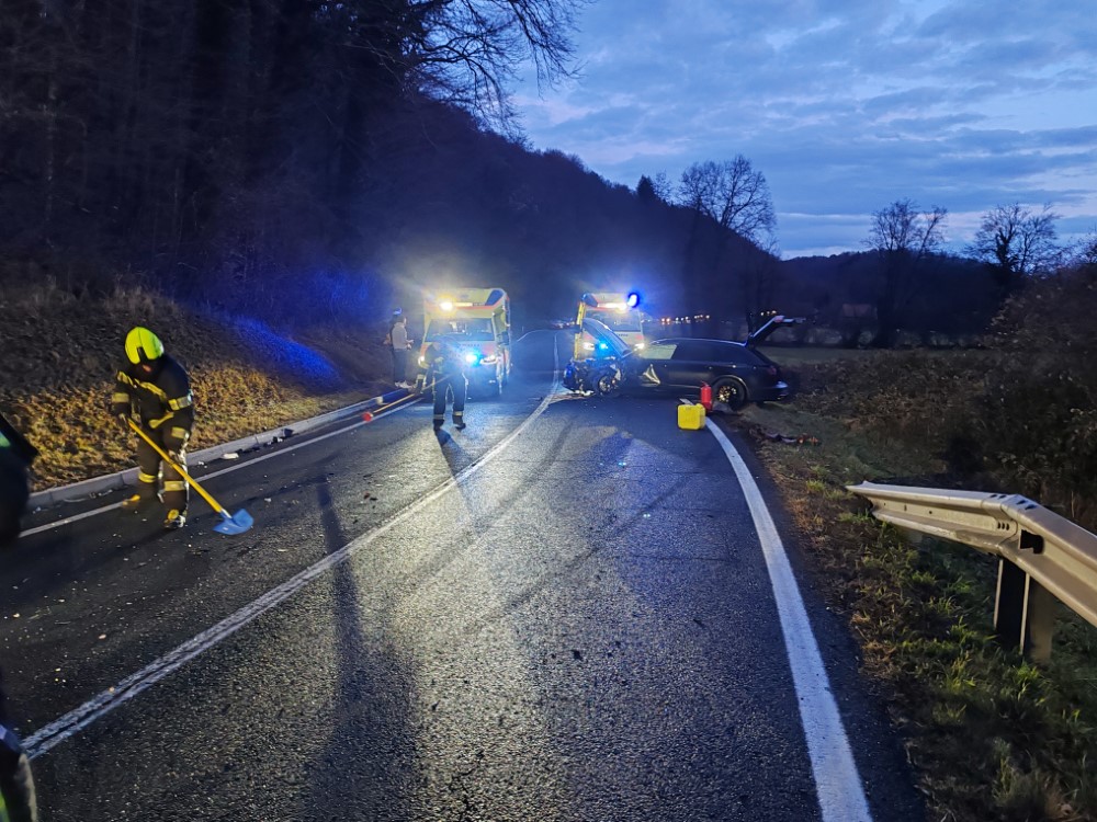 Ob 16:08 je prišlo do trčenja dveh osebnih vozil na cesti Pivka Ilirska Bistrica blizu Ribnice, občina Pivka. Posredovali smo gasilci PGD Pivka in Postojna, kraj nesreče smo prometno in požarno zavarovali, odklopili akumulatorja, nudili pomoč ekipi NMP, razsvetljevali kraj nesreče, počistili razlite motorne tekočine in pomagali drugim službam. V nesreči so bile tri osebe lažje in dve osebe težje poškodovane.