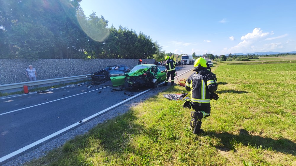 Ob 16.47 sta na cesti Postojna - Pivka, občina Pivka, pri odcepu za naselje Gradec, trčili dve osebni vozili. V prometni nesreči je bilo udeleženo še eno osebno vozilo, ki pa je zaradi izogibanja prometni nesreči zapeljalo na polje. Posredovali smo gasilci PGD Pivka in PGD Postojna. Na kraju dogodka smo požarno in prometno zavarovali, nudili pomoč poškodovanim osebam pred prihodom reševalcev NMP Postojna in Cerknica. Iz enega osebnega vozila smo gasilci s tehničnim posegom rešili ukleščeno voznico, razlite motorne tekočine posuli z absorbentom, odklopili akumulatorje, zavarovali kraj pristanka dveh helikopterjev ter nudili pomoč reševalcem pri prenosu poškodovanih oseb do reševalnega vozila in helikopterja. Dve osebi so bili s helikopterjema odpeljani v UKC še eno pa so reševalci NMP Cerknica odpeljali tudi v UKC Ljubljana. Dve osebi sta v nesreči preminuli.